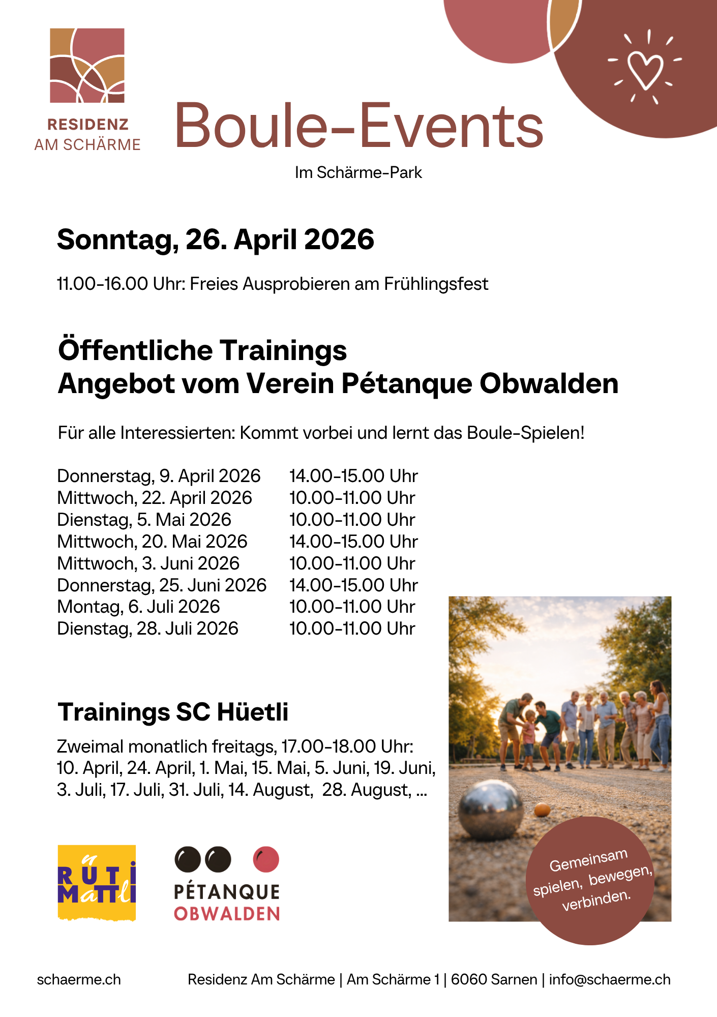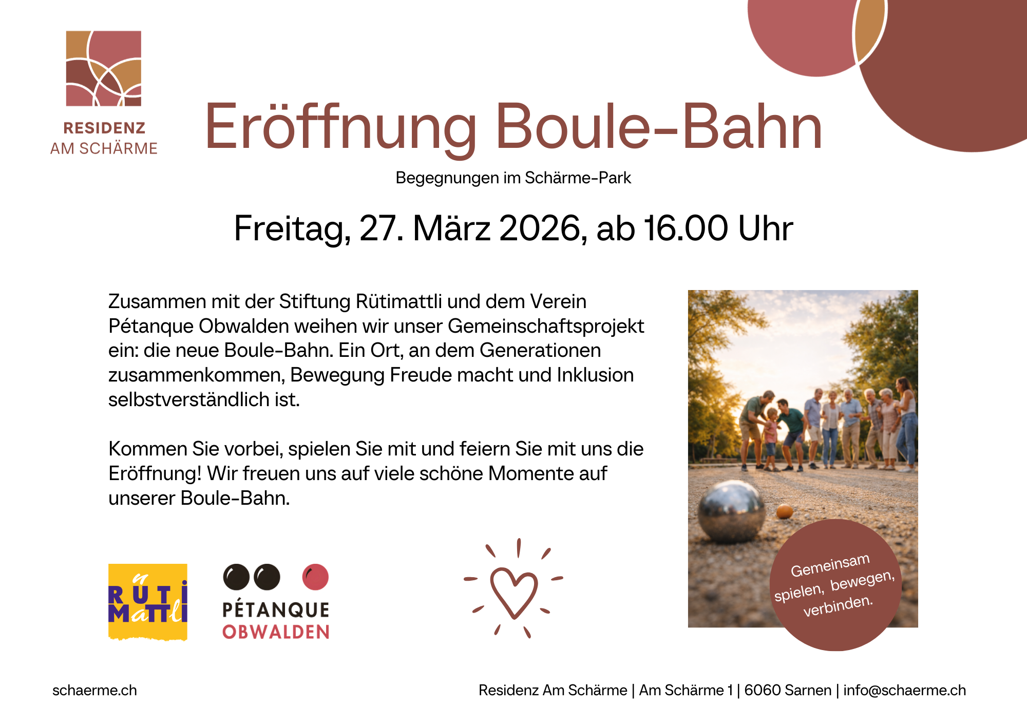 Ob gut umsorgt im praktischen Pflegezimmer oder selbständig in der grosszügigen Residenzwohnung – Am Schärme finden alle Menschen das passende Zuhause. Ein attraktives Programm und vielfältige Dienstleistungen garantieren einen abwechslungsreichen und genussvollen Alltag. Kommen Sie vorbei und entdecken Sie das «Dorf im Dorf» im Herzen von Sarnen!